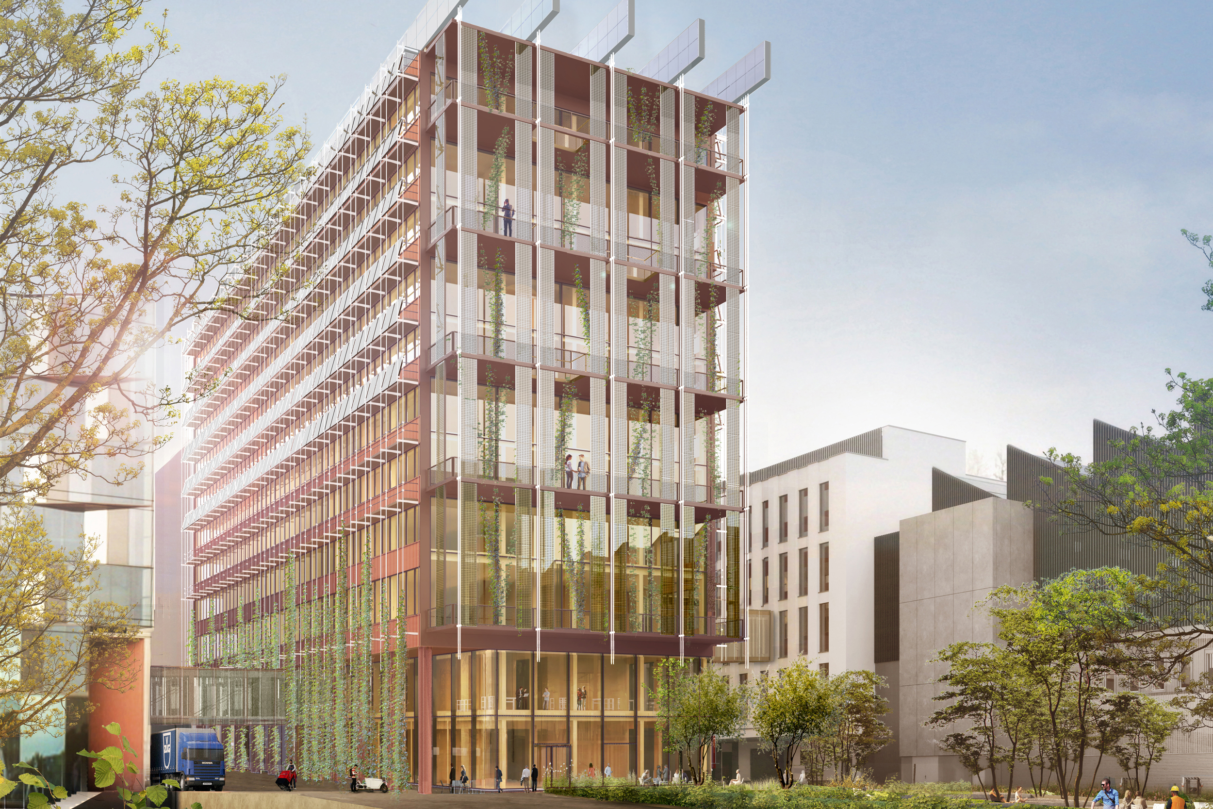 In der Verlängerung der Ahornstrasse – in der Mitte des Tech Cluster – entstehen mit refActory und Zephyr West zwei Gebäude, die mit den umgebenden Freiflächen die Eingangszone zum Tech Cluster bilden werden.