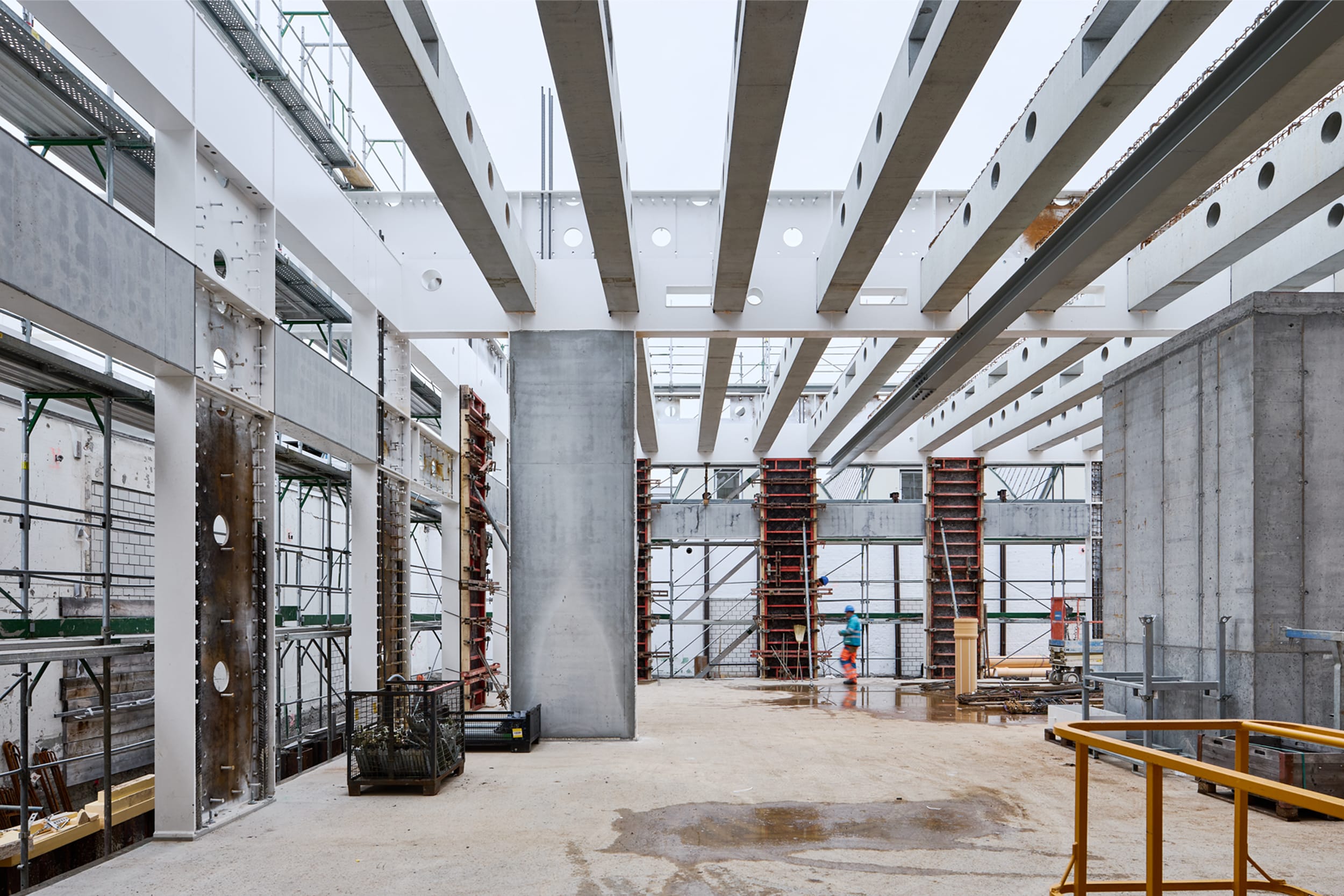 Nachhaltigkeit zeigt sich nicht nur in der Baukonstruktion, sondern beginnt bereits bei der Grundkonzeption des Gebäudes. Die weitläufigen Produktionshallen sind so konzipiert, dass grosse Flächen ohne Stützen und mit hohen Nutzlasten realisiert werden können. Zudem sind die Tragwerke der Produktions- und Verwaltungsbereiche konstruktiv voneinander getrennt. Durch die Entkoppelung wird verhindert, dass sich Vibrationen aus der Fertigung auf das gesamte Gebäude übertragen.